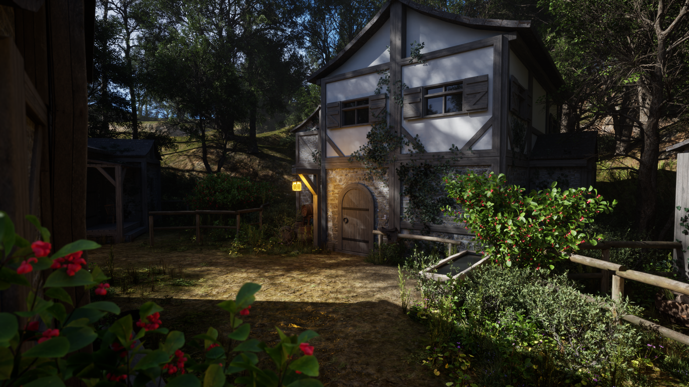 Modelled and textured house modules in a medieval fantasy style, assembled into a village environment in Unreal Engine.